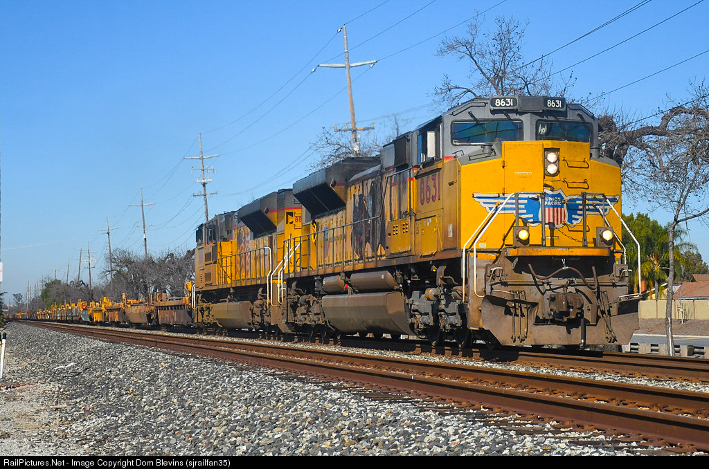 | UP SD70ACe 8631 and UP SD70AH 8881 leads a Southbound Oakland, CA to Long Beach, CA Intermodal Repo Train past South San Jose. |