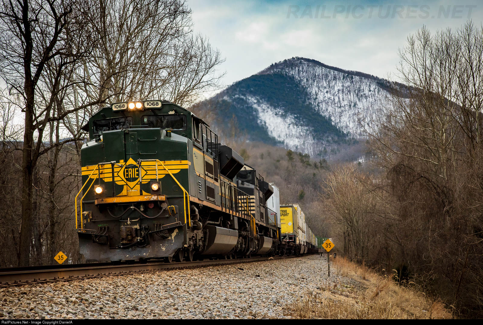 A late NS 202 rushes east through Wabun, Va on the Christiansburg district. The Erie heritage unit leads the train by a snowy mountain on it's way to a crew change in Roanoke.
