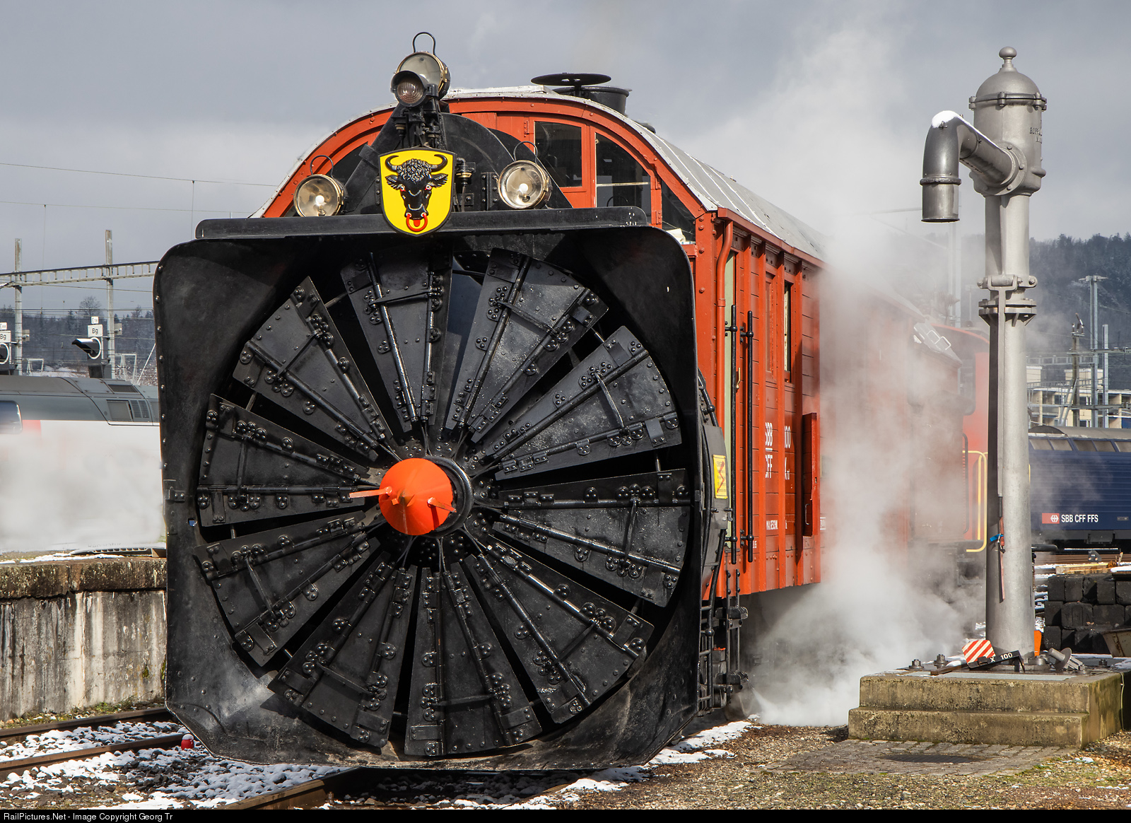 40 years after the steam rotary snow blower Xrot # 100 was retired and exhibited in the Swiss Museum of Transport (VHS) Lucerne, this 125 years old vehicle was steamed up this day in Brugg AG. Work was made by the steam group Zürich (Verein Dampfgruppe Zürich VDZ), initiated and headed by Stefan Landenberger. The Xrot # 100 was built in 1896 by Henschel & Sohn in Cassel/Germany for the Gotthard railway, under licence of Leslie and has about 800 HP. The approximately 10-foot wheel (2,96 meter) turns at up to 140 revolutions per minute.