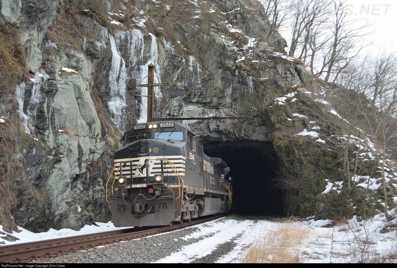 | An empty NS coal train from the Port of Baltimore emerges from Williams Tunnel on Pennsylvania Railroad's former Columbia & Port Deposit Branch. Williams Tunnel has the distinction of being the only tunnel located in Pennsylvania on the Port Road Branch. The other two tunnels, Frazier and Wildcat, are a few miles to the east and located within Maryland. |