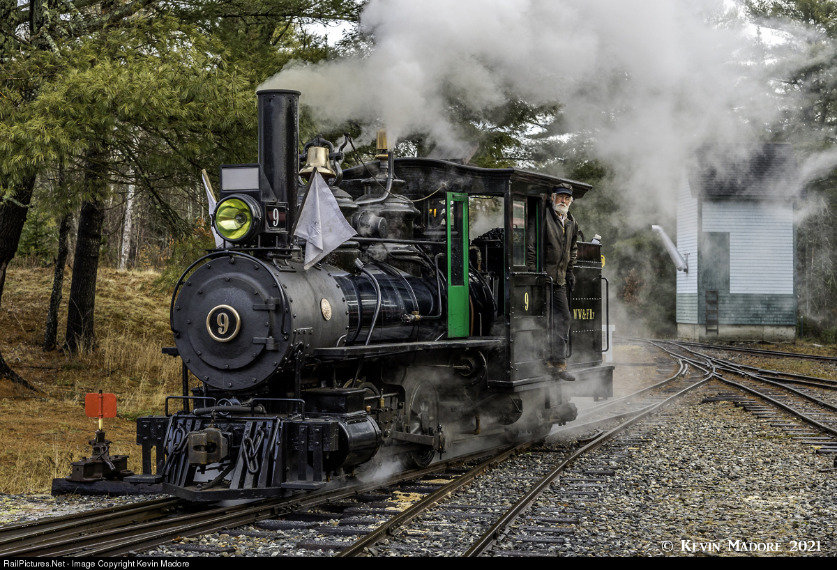 Locomotive #9 is an 1891 product of the Portland Company and served 4 of Maine's 24" gauge railroads over the course of a 42 year career that ended in 1933. After literally spending 50 years in a barn on a farm in Connecticut, she returned to Maine and has been restored to run on the rails of the very last employer she served, the Wiscasset, Waterville & Farmington Railway, which today is a museum in Alna, Maine.