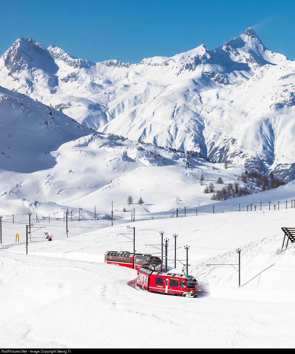 | "Allegra" railcar ABe 8/12 # 3506 of the Rheatian Railway is pulling train 4637 from St.Moritz to Tirano on the Bernina line between Bernina Lagalb and Ospizio Bernina, In the background piz Saluver and Piz Ot. |