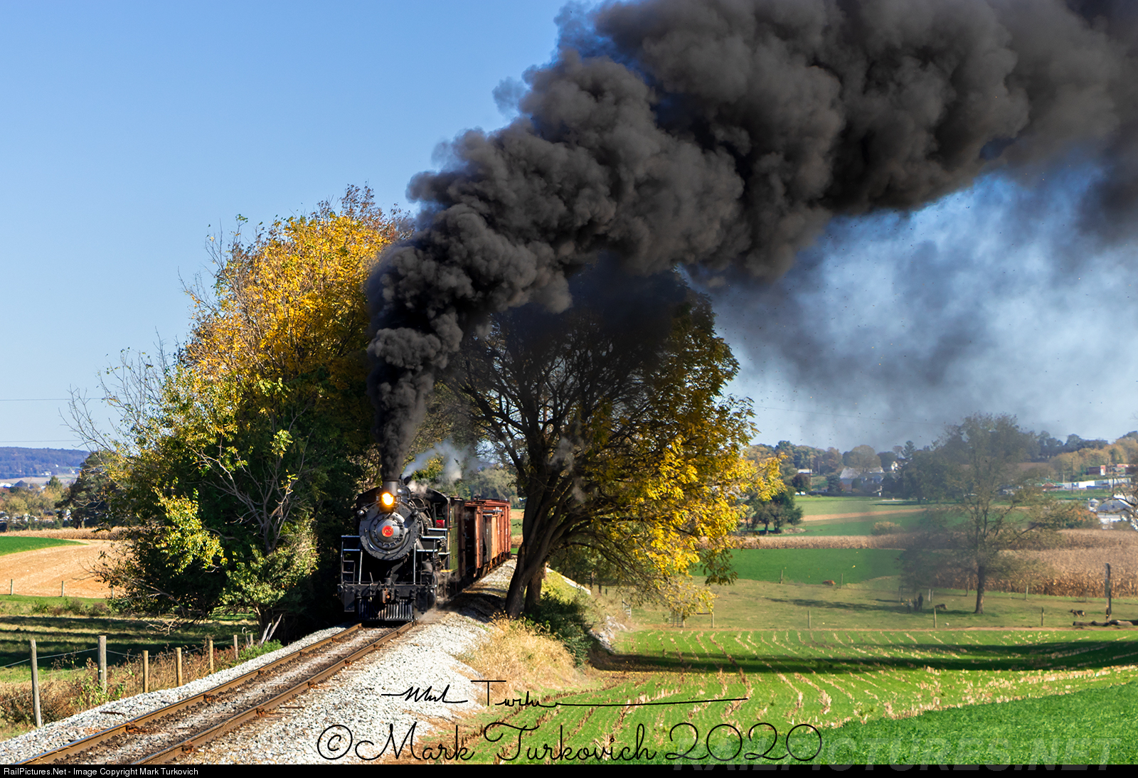 | Strasburg Railroad 90 charges up the grade near Carpenters. The cloudless October day allowed for gorgeous lighting and a beautiful sky background and the cold temperatures allowed for lots of smoke. |