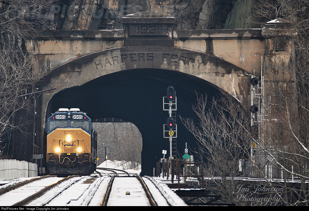 | CSX 9969, former MARC GP40WH-2 #69, emerges from the tunnel at Harpers Ferry. The engine is back on home rails leading the W003 inspection train from Baltimore to Cumberland on a snowy day. |