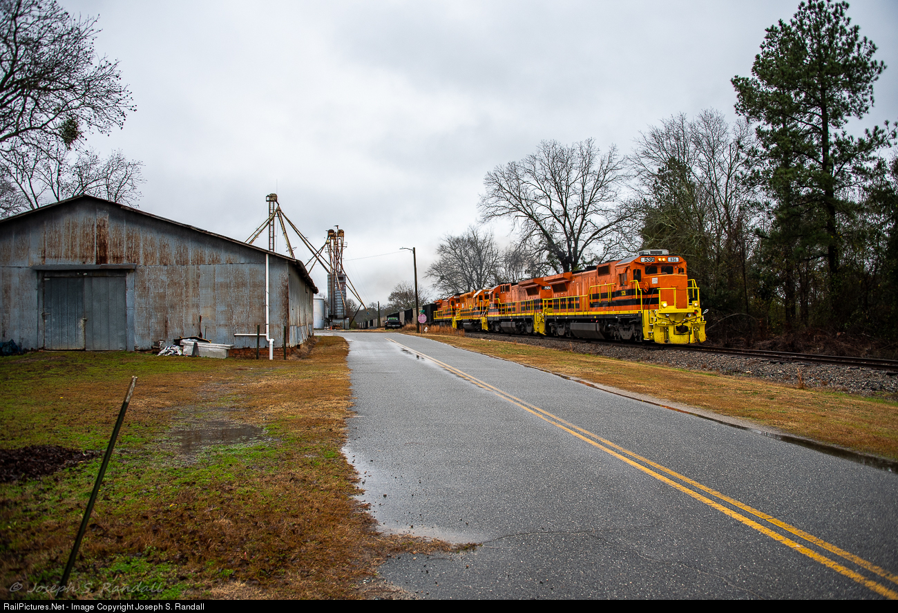 | Georgia Central L781 runs track speed through Dudley as it heads north for Macon. With the line in need of higher horsepower engines that can traverse the entire line, G&W decided to lease some former Norfolk Southern B32-8's from GE, marking the return of GE locomotives to the GC since the high hood U23B's were retired in 2015. |