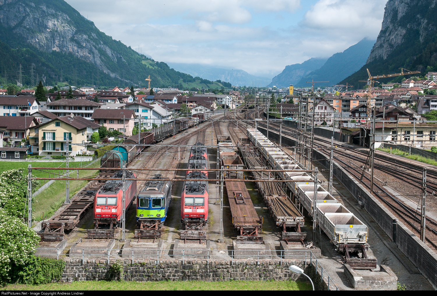 | Erstfeld is the beginning or the northern end point of the mountain route. In 2010 there was a visitor tower in the area of the depot, which allowed an unusual overview. Here you can see a storage group that was mainly used by locomotives that did not belong to the SBB. The BLS locomotive Re 4/4 501-9 is parked here, framed by 185 109-6 and 185 096-5. |