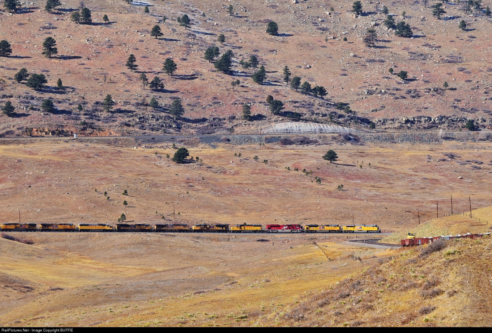 UP 3027 (SD70AH) leads a long line of UP motors through Little Ten Curve and will soon pass the Rocky Siding on the way to Denver, Colorado.