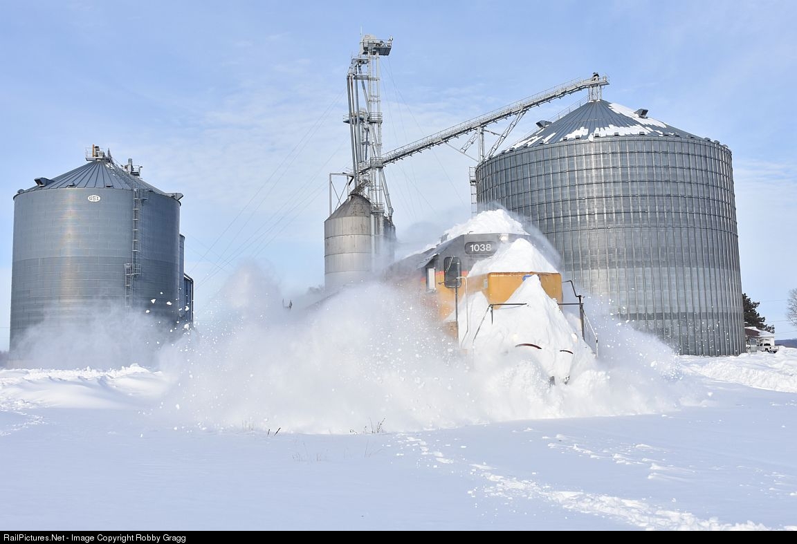 UP GP60 1038 busts through snow banks at Rollo, already encased in snow from further north.