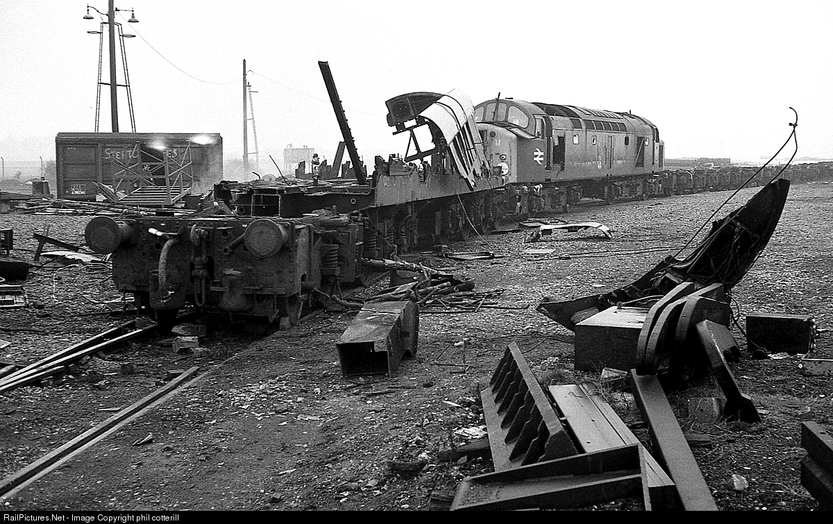 | Class 45 Sulzer No 45030 and English-Electric 40042 are being scrapped at Derby loco works in 1981. Looks like someone has bought the panel with the loco number on from 40042. |