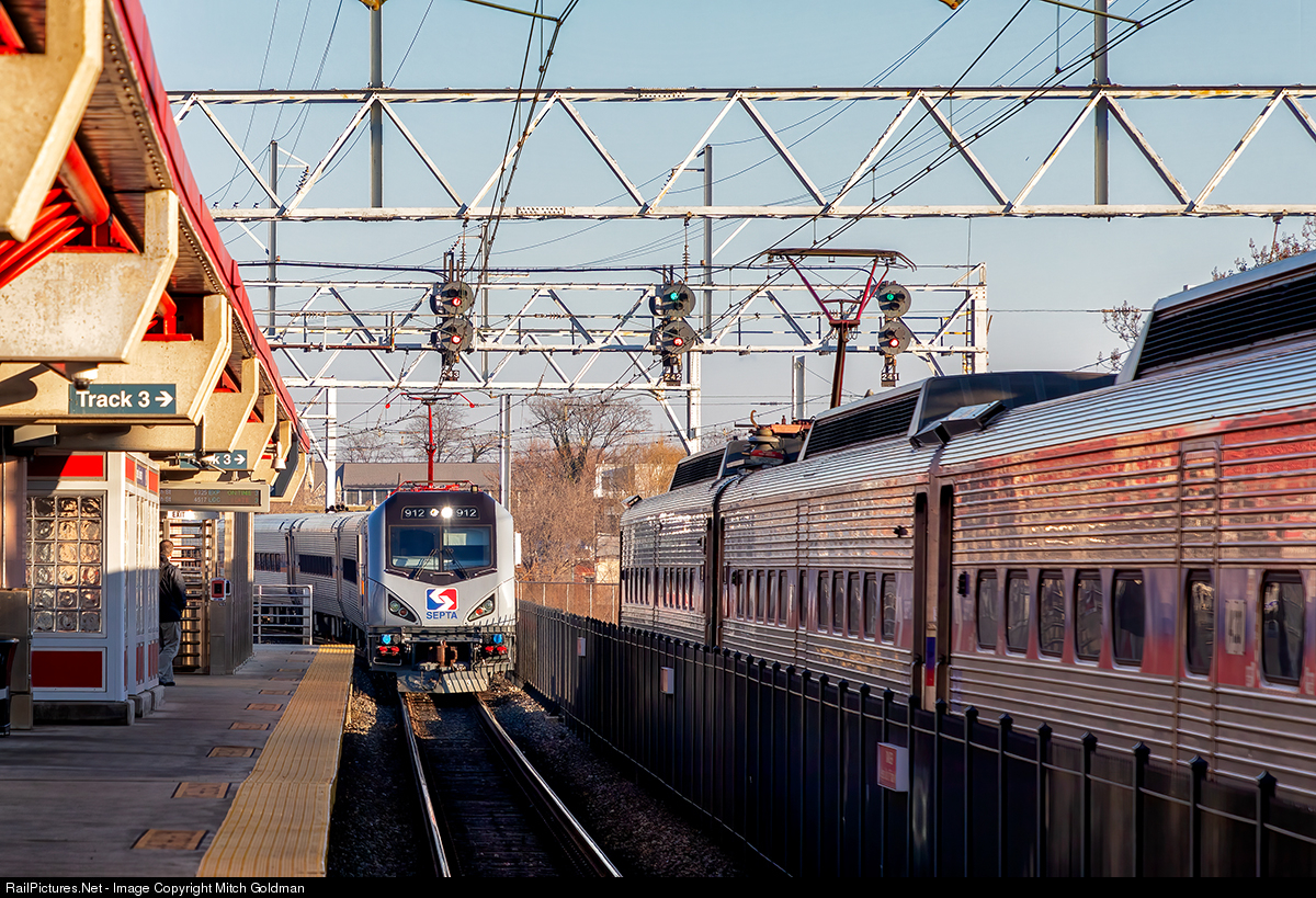 A set of SEPTA Silverliner's prepare to depart as a southbound express rolls in from the north, led by SPAX No. 912 with a set of borrowed MARC cars in tow.