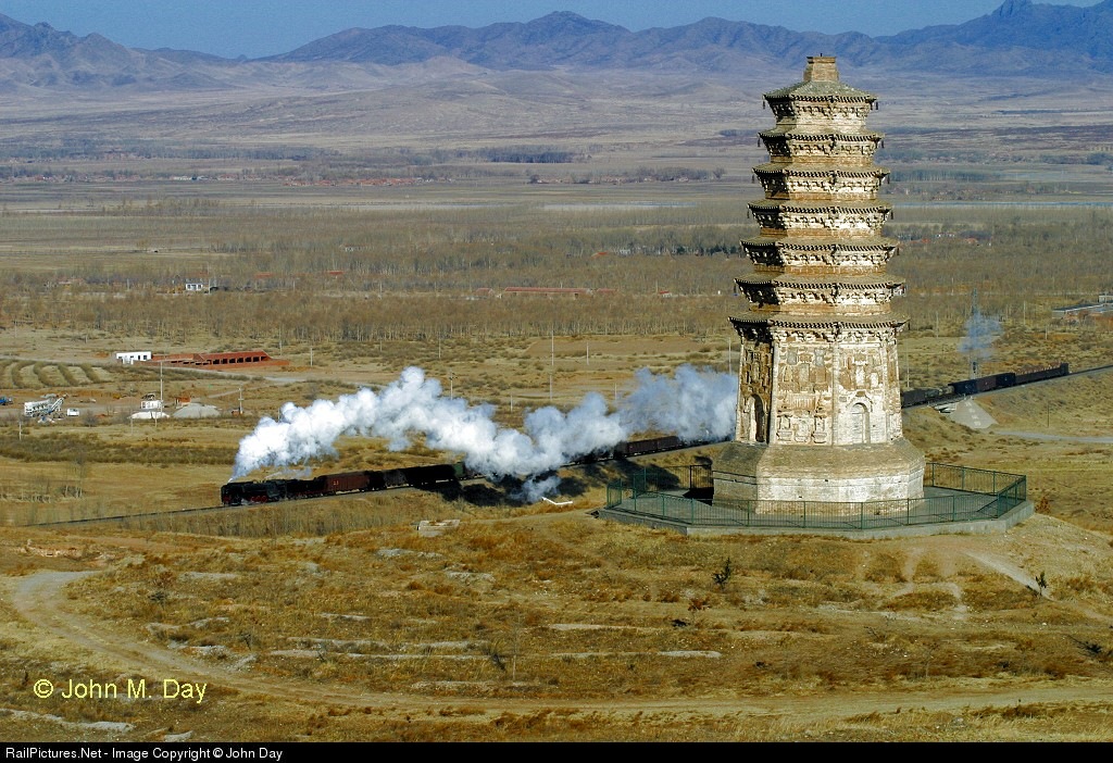 A QJ's exhaust temporarily drowns out the temple bells as it leaves Lindong for Daban