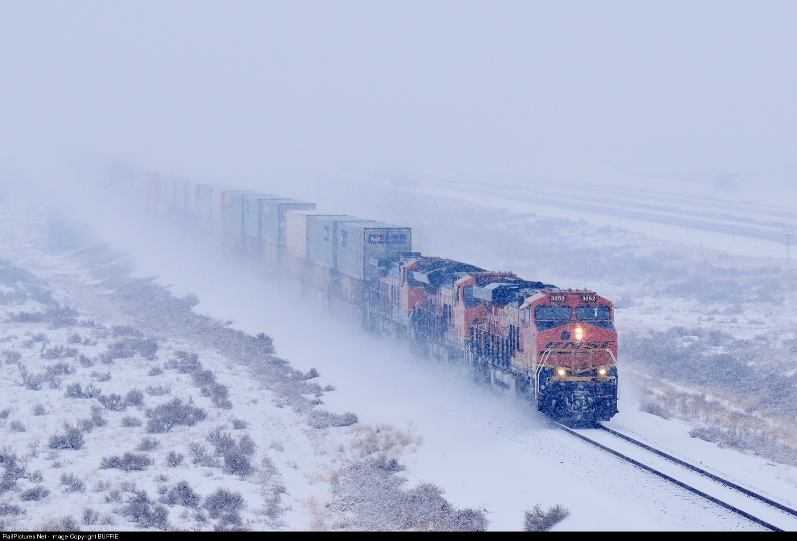 BNSF 3252 (ES44C4) leads the Z Train towards Fort Morgan and whips up the snow as it runs at track speed.