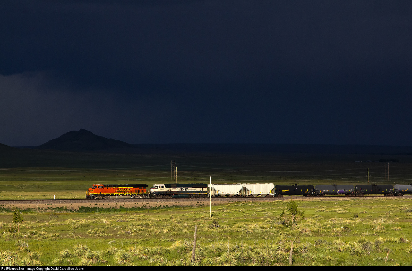 A Belen, NM to Denver, CO manifest train is tied down in the siding of Lynn, CO, along BNSF's Spanish Peaks Subdivision, as a summer thunder storm rages in the background. In 2019, the North/ South Loop between Denver and Amarillo, TX was overflowing with trains due to flooding in Nebraska. This resulted in a rerouted of traffic along this primarily single track railroad. This manifest is waiting for Denver yard to have room for it.
