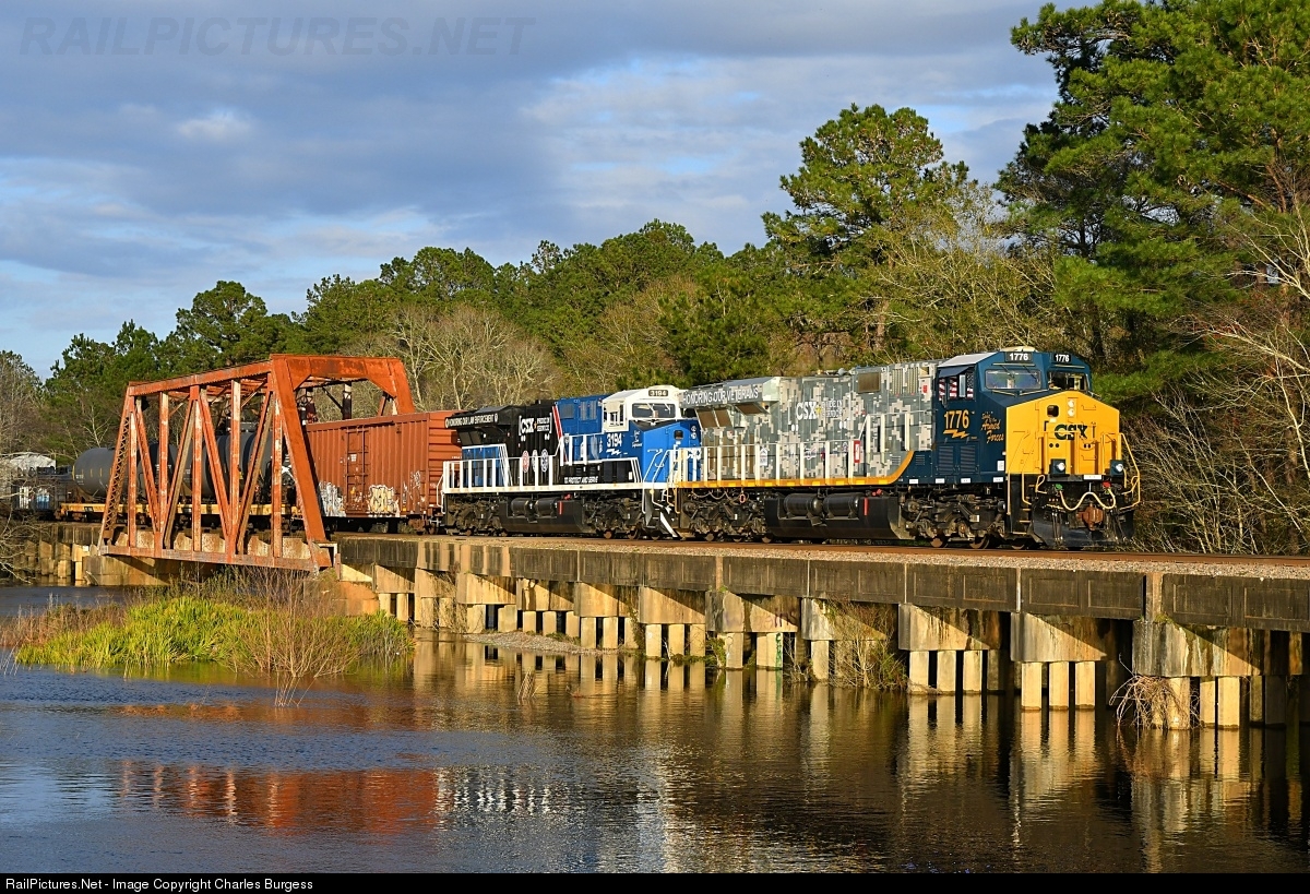 Two of the three CSX Pride in Service locomotives (CSX 911 was the mid-train DPU) lead a Selkirk, New York to Waycross, Georgia mixed freight across the rain swollen Satilla River outside Waycross. It was really nice to see a lot of the local residents out to video and photograph these beautiful locomotives. A big thanks to Eric Hendrickson for making these units possible.