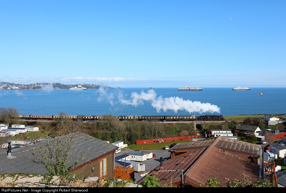 | 75014 Braveheart climbs past Waterside Camp hauling the 13:25 Paignton Queens Park to Kingswear staff training run on Monday 22nd February 2021. Cruise ships Marella Explorer, Eurodam and Volendam anchored in the bay |