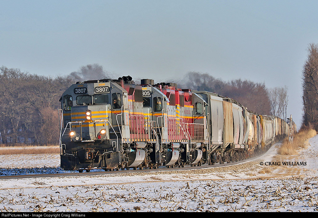 The Iowa Northern's North Crew swing around the curve as they drop down into the southside of Shell Rock. The job is a healthy 88 cars today mainly made up of CP empties bound for Nora Springs, IANR empties, and a few freight cars. The crew will do work at Butler, the next stop about 8 miles ahead. Kind of an odd 3 unit GP 38 lashup today, as not slugs are found. A few ex-Rock Island signals can still be found here and there along the route.