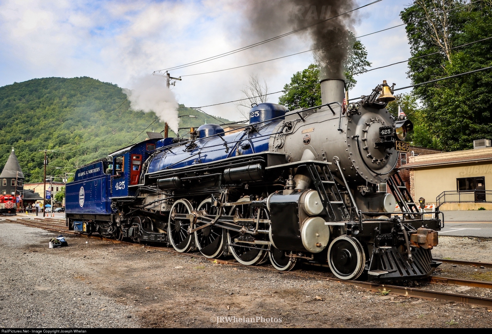 "Before the Storm" One of the loudest, if not, the loudest, steam locomotive in the United States, R&N 425, simmers quietly in Jim Thorpe. She builds pressure shortly before coupling up to a 12-car train, which she will haul with ease up the steep grades of the Lehigh Gorge. In addition, EMD SD-50 #5018 is in the background, on display at the CNJ Jim Thorpe Station.