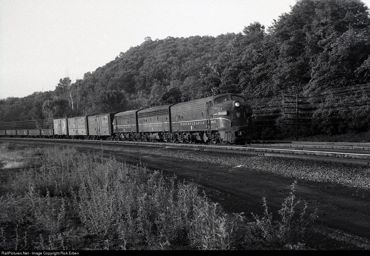 Rolling out of yesterday, PRR FP-7 9835 leads F-3 9547B and F-7 9787 through the big curve east of Mifflin, PA (approx. MP 153) just after 6am. Seeing an A-B-A set of Fs at this time was becoming uncommon with the influx of 2nd generation power. Renumbering and more spartan lettering for the upcoming Penn Central merger would soon render the classic PRR freight scheme unusual. Nice head-end consist with the Western Pacific, Rio Grande gold and silver and "Everywhere West" boxcars. Four tracks had been reduced to three along much of the old Middle Division by this time, with the middle track signaled for movement in both directions.
