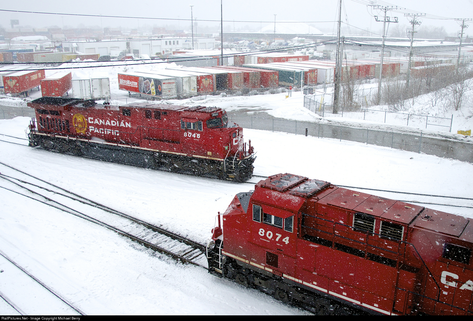| On a snowy morning, CP 112's mid-train DPU (CP 8046) is temporarily tied down at left, as the head end power shoves a last cut of intermodal cars into Lachine IMS Yard. |