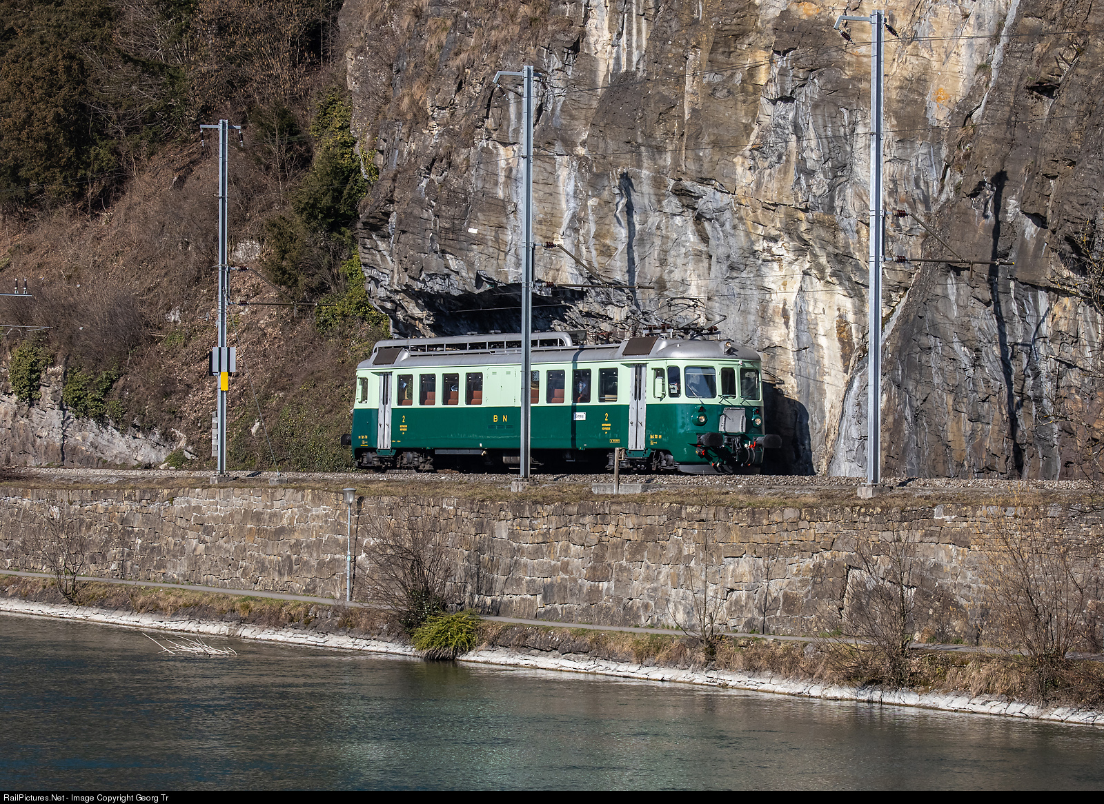 | Transfer run of the railcar Be 4/4 # 761 of the BLS Stiftung (BLS Foundation), called the "Wellensittich" (budgerigar), from Burgdorf via Zollikofen-Thun-Spiez to Interlaken Ost (BLS workshop Bönigen). This high power railcar with 1470 kW was built in 1953 for the Bern-Neuenburg-Bahn (BN). This now historic vehicle operated by the BLS Stiftung and based in Burgdorf has the paint scheme of the years 1958 to 1963 again and the inscription "BN" for Bern-Neuenburg-Bahn. The railcar is now running along the Aare canal and will arrive in Interlaken Ost in a few seconds. |