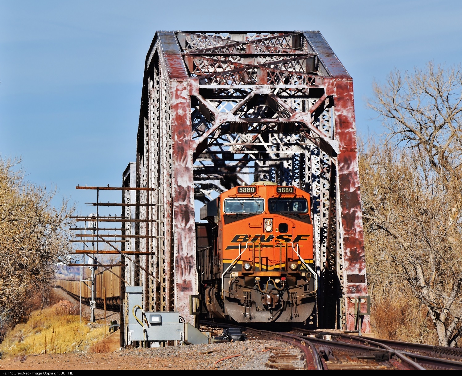 BNSF 5880 (ES44AC) pushes an empty coal on the Joint Line through the bridge at Nixon, Colorado.