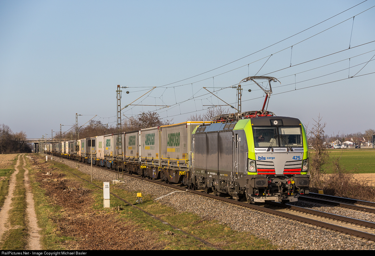| BLS Cargo 193 425 pulls its Ambrogio swap body train towards Switzerland. This is a Vectron from Siemens Mobility. However, under the name "425 193" there is also a BLS series RE 4/4 locomotive. |
