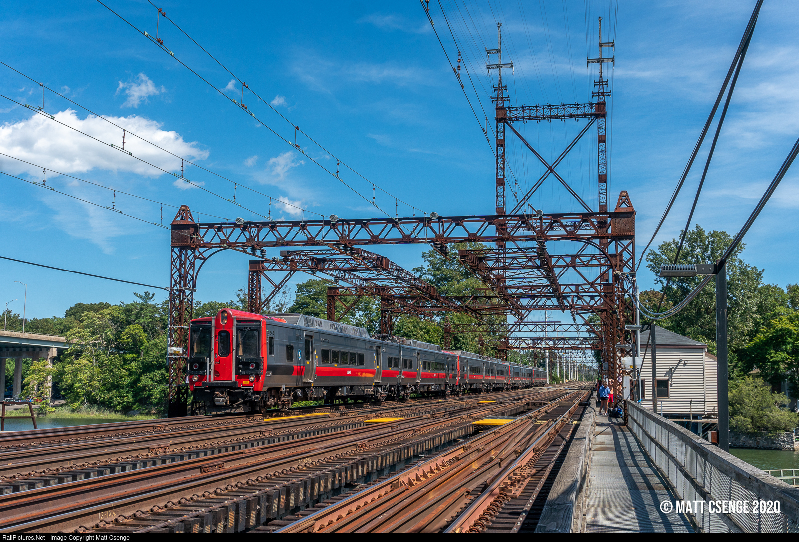 | Power Draw. An inbound New Haven Line train crosses the Saugatuck River Railroad Bridge in Westport, CT. The bridge has a pedestrian walkway on the south side, which apparently is also good for jumping into the river below! |