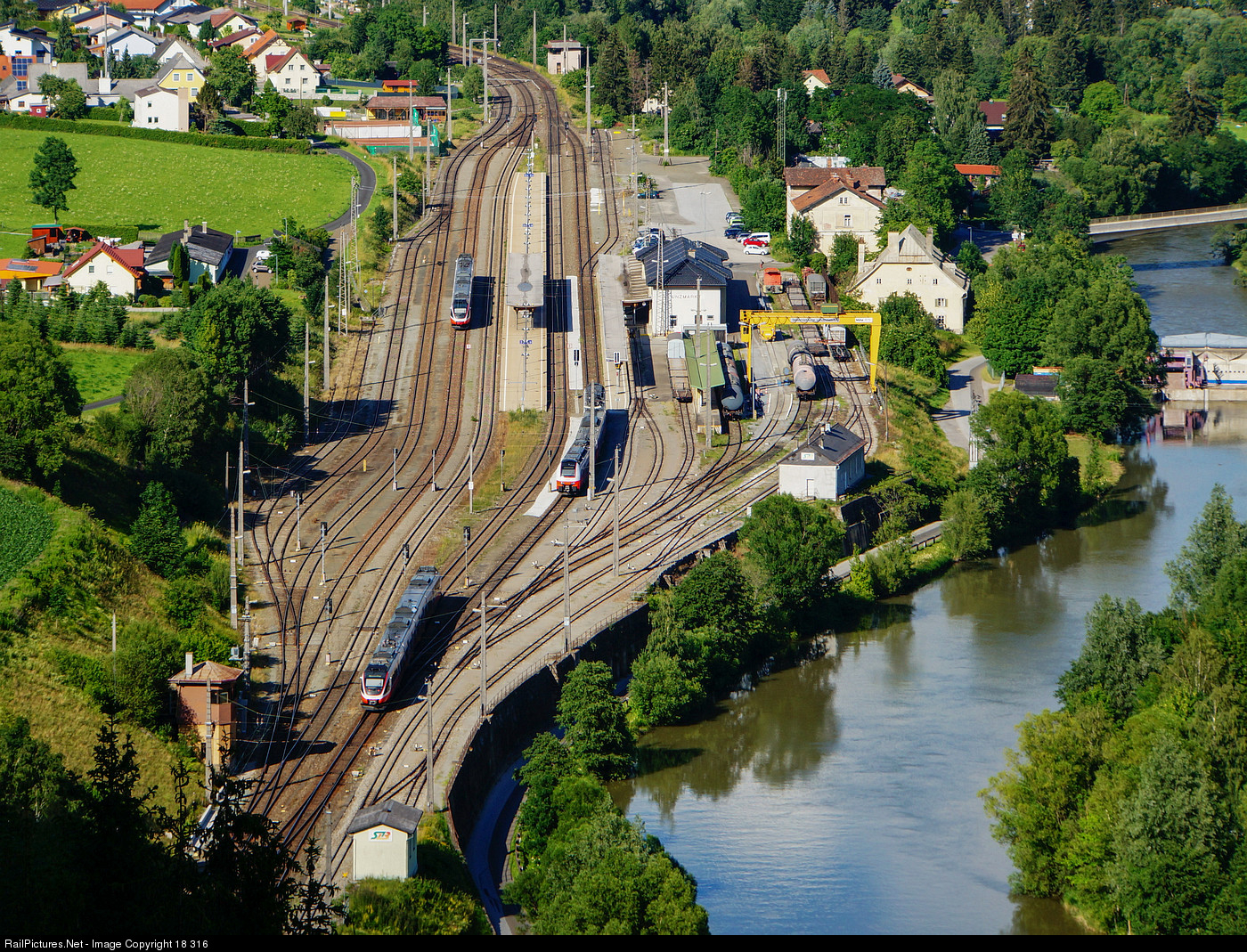 Having descended the Neumarkter Sattel incline on Austria's Rudolfsbahn line, a class 4024 EMU will soon arrive on Platform 2 of Unzmarkt station on the shore of the Mur river, while another class 4024 and a newer class 4744 EMU wait for their next service. This station is the junction station with the narrow-gauge Murtalbahn (operated by regional railway Steiermarkbahn), which still sees heavy cargo traffic, all of which (including fuel) has to be re-loaded between standard-gauge and narrow-gauge wagons, hence the still very much operational cargo facilities on the right.