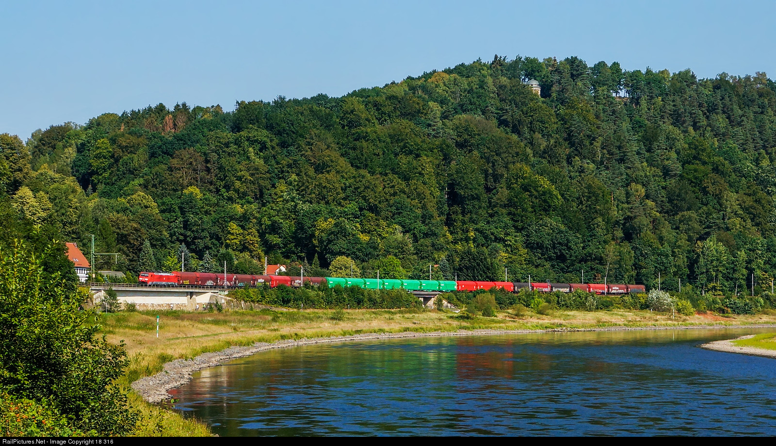 | On its way to the Czech Republic along the Elbe river, a very dirty four-voltage class 189 with a colorful train of 25 covered wagons passes under the Biedermann Mausoleum. |