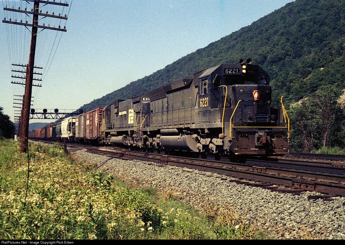 Symbol freight PR-4 for Philadelphia comes booming down the valley through Lewistown Narrows on a summer afternoon. EMD, GE and Alco four and six axle power was prevalent at this time. That Century 628 second out had received its ignominious Penn Central colors that were no more bland than the spartan PRR decal on the SD45. Still, it was a great time to be watching trains.
