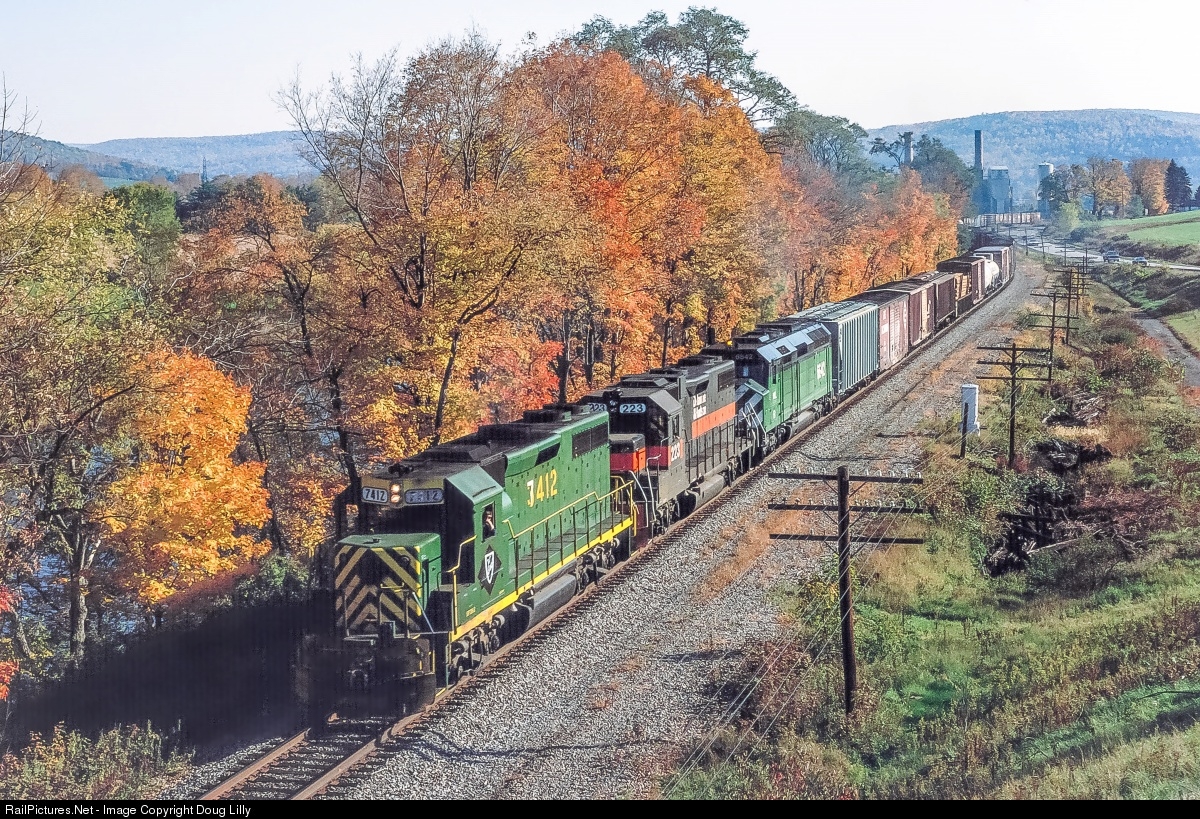 Twelve years after the Delaware & Hudson inherited the Reading’s GP39-2’s, one of them is still wearing its Reading colors. It’s seen here with a D&H GP38-2 and a National Railway Leasing F45 pulling a northbound D&H manifest through the fall colors at Bainbridge, New York.
