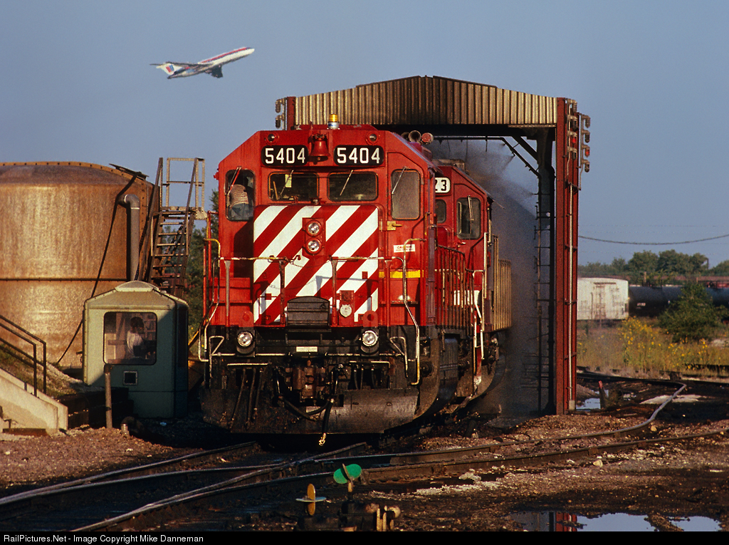 Getting a bath Late in the day of September 17, 1989, CP Rail EMD SD40 No. 5404 and a Soo Line SD40-2 are run through the wash building at Soo Line’s former Milwaukee Road Bensenville Yard locomotive facility. Located near busy O’Hare International Airport, a United Airlines flight takes off in the background.