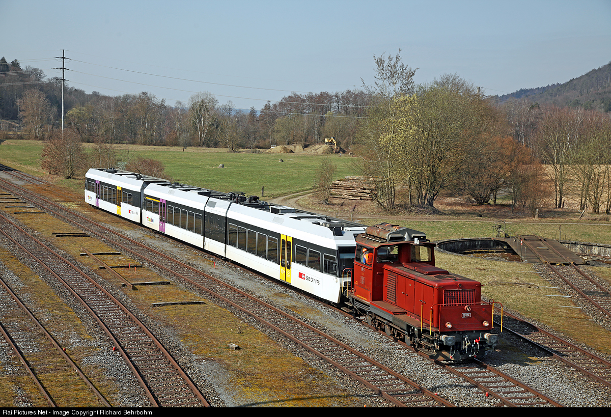 | Former SBB diesellocomotive Em 3/3 18814, built in 1962, now owned and operated by SEHR (heritage railroad Etzwilen - Singen) is shuntig RABe 526 681 and cab car Bt 29 35 221 of Thurbo. These trainsets will be taken out of service. They were constructed in 1998/1999 by Stadler for the Mittelthurgau-Bahn (MThB). |