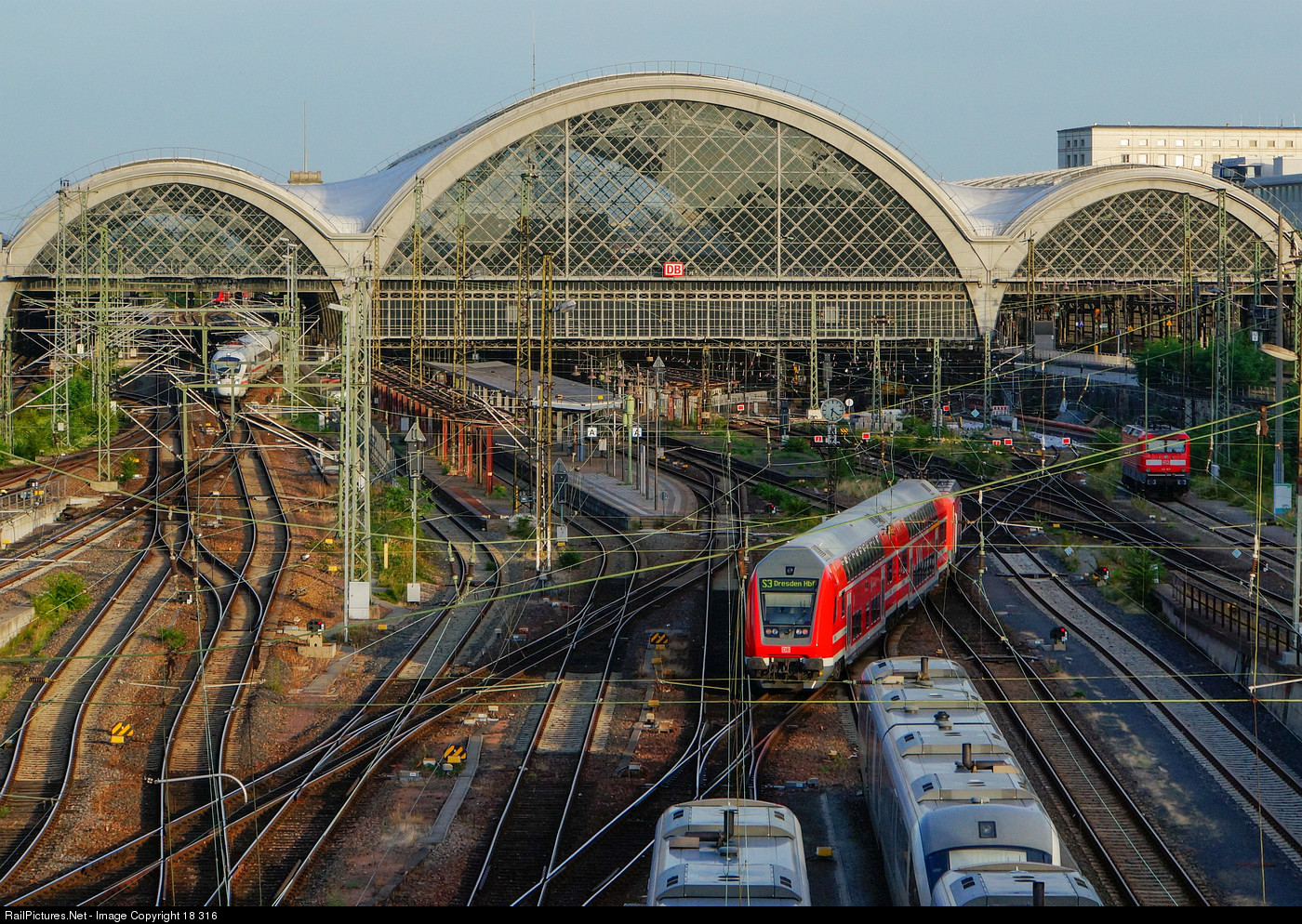 | A double-deck S-Bahn (suburban rapid transit) train from Tharandt went around parked Vogtlandbahn Desiro DMUs and will soon arrive on platform 12 in Dresden's main station, while ICE-T tilting semi-high-speed train 411 055 departs for Frankfurt (Main) from track 17. At that time, the lower part of the station still had parts under renovation that showed the damage of the catastrophic flood of 2002. |