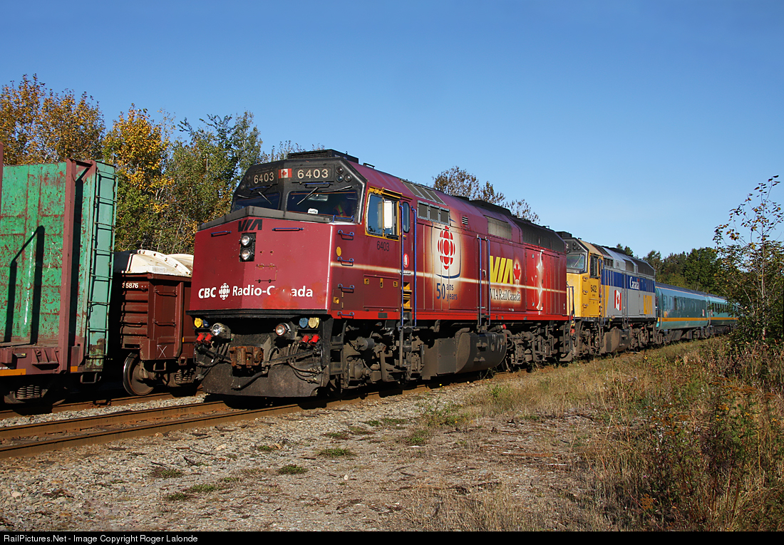 VIA 6403 wearing the 50th anniversary CBC/Radio Canada paint scheme, with VIA 6432 near Bathurst VIA Station.