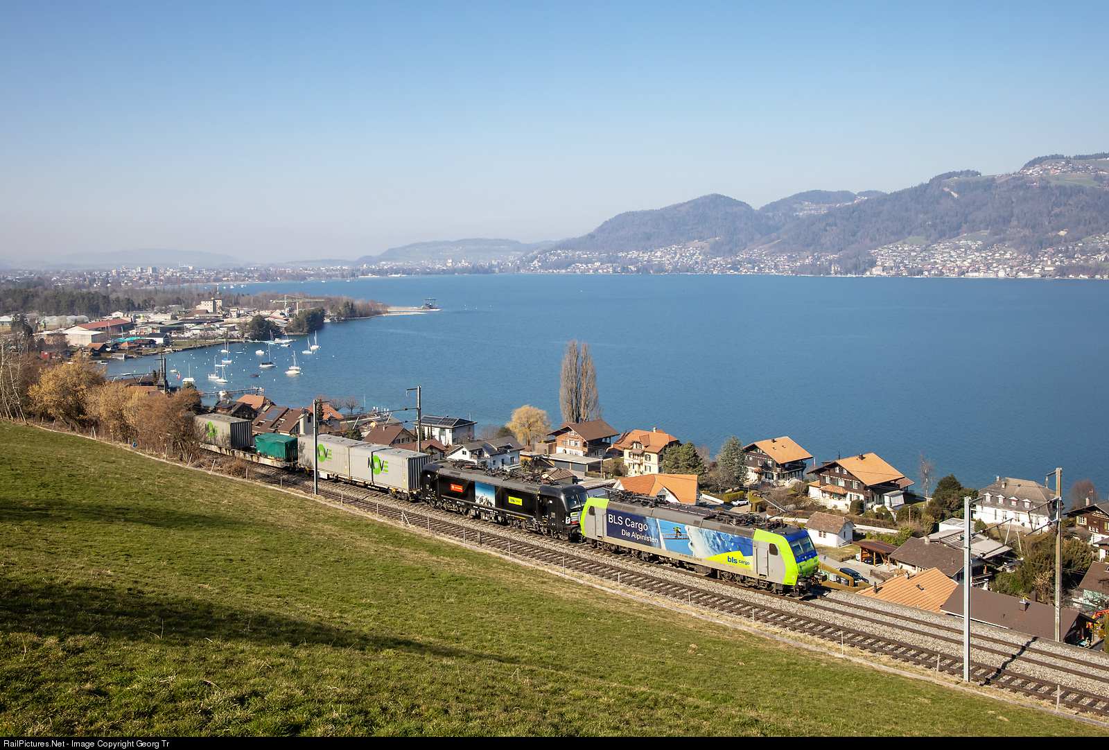 RailPictures.Net Photo: 485 020, 193 713 BLS Cargo Re 485, 193 at Spiez, Switzerland by Georg Trüb
