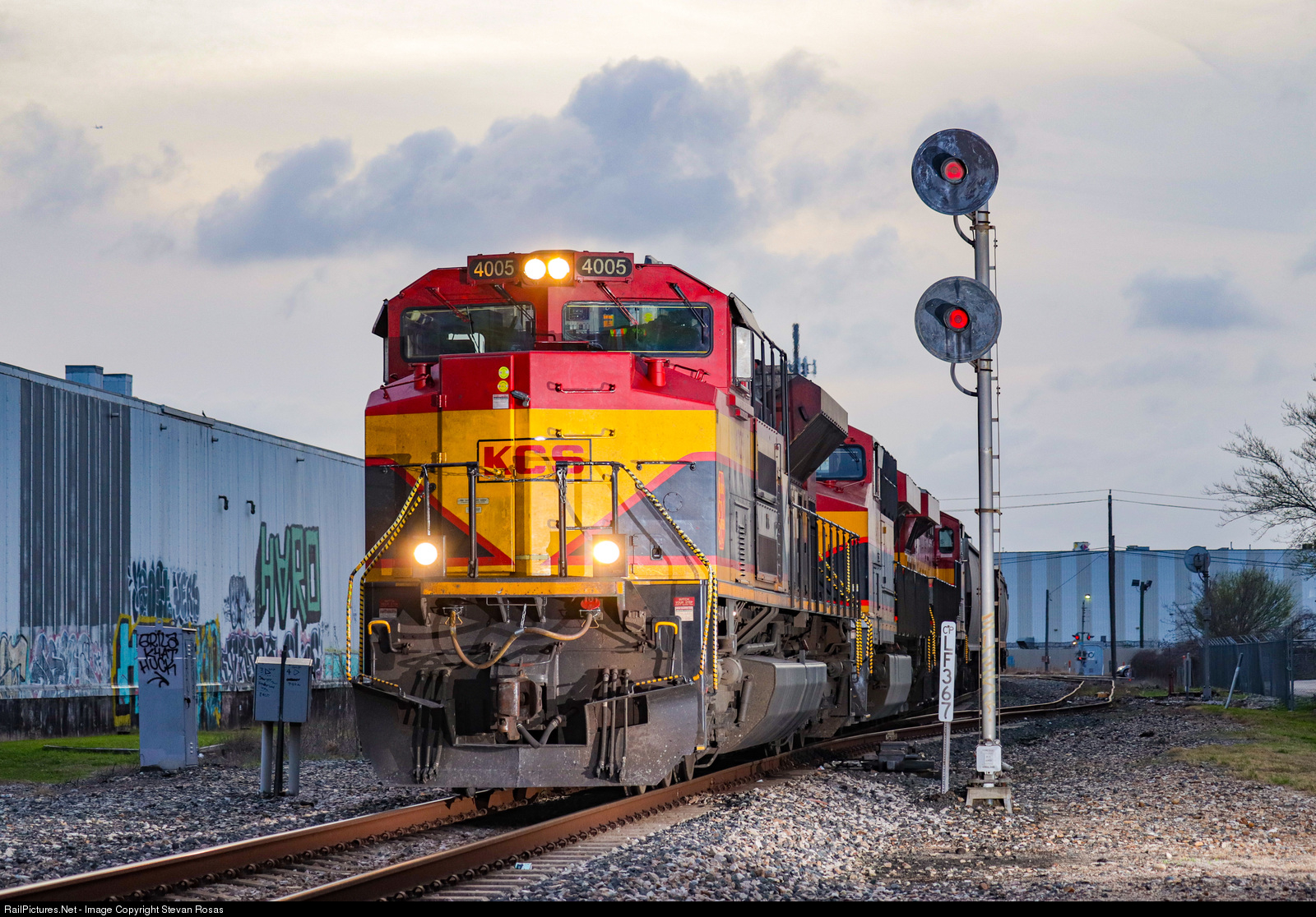 | KCS 4005 leading an empty northbound grain train through the Houston Terminal. Amazingly, some of these 60+ year old signals have stood the test of progress into 2021, soon to also succumb like many similar examples. |