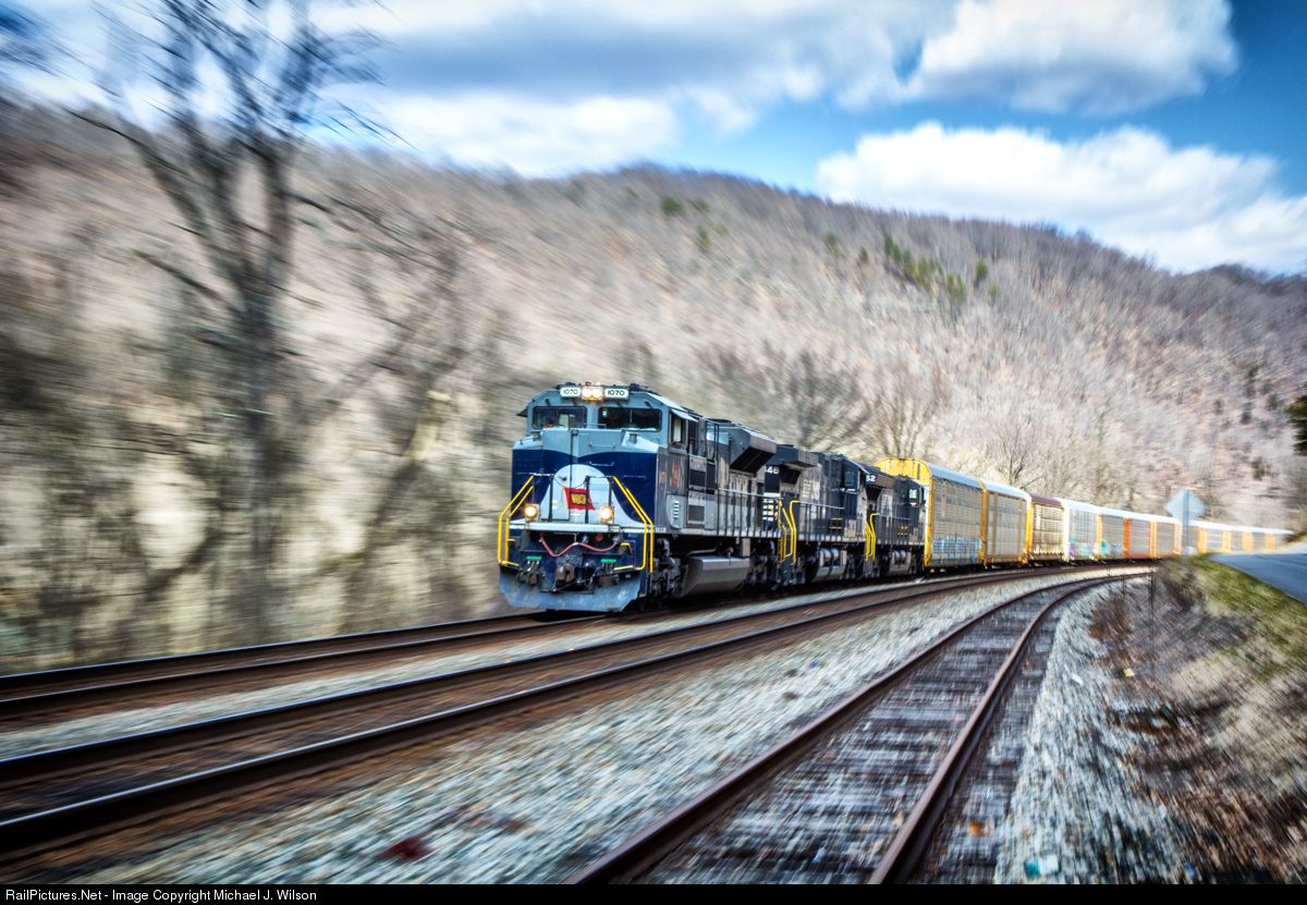 NS 393, with Wabash heritage unit #1070 leading, flies west along Norfolk Southern's Christiansburg District outside of Glen Lyn, VA on March 7, 2021. Zoom pan at 1/13th a second.