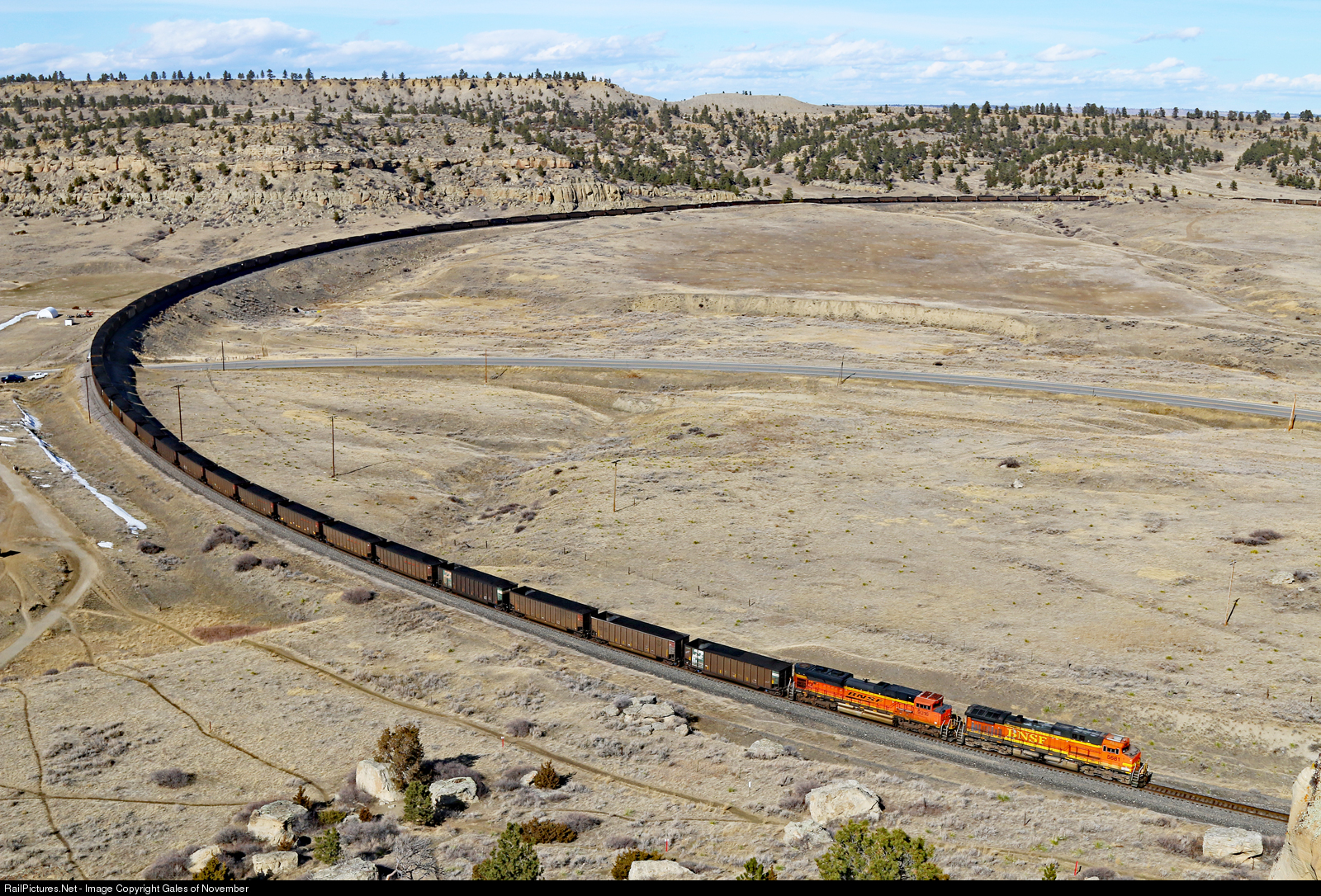 This looks like a horseshoe curve, but in reality, this is the top of an absolutely massive S curve. I would estimate it's about 3-5 miles long. Seen here, with dynamics whining this load from Signal Peaks is 11 miles from entering the MRL and on to the west coast. I will try to get the flying camera up soon to get a view of the curve, if its even possible to fit it all into one shot! Also, this is no drone shot. Just a gut busting hour long hike into rattlesnake country!