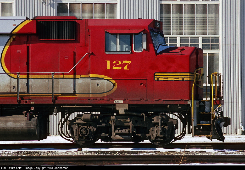 Santa Fe EMD GP60M No. 127 shows off its famous warbonnet-clad profile while resting at the locomotive facility at Corwith Yard in Chicago, Illinois, on the morning of January 26, 1991.
