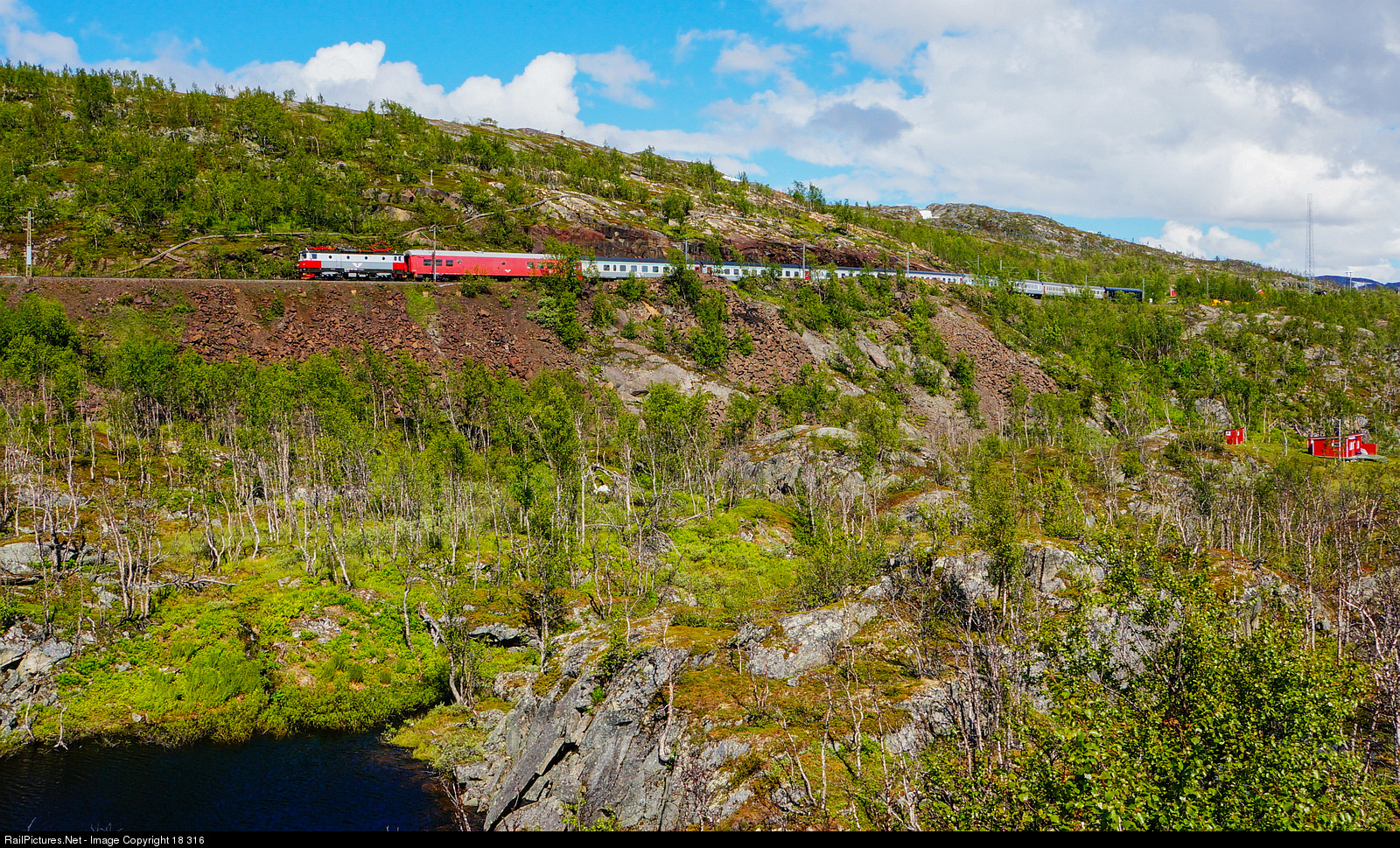 | An all-Swedish night train from the Swedish capital Stockholm to the Norwegian port city of Narvik passed the border and the Baltic Sea - Atlantic water divide five minutes earlier and began its long descent to sea level (the last but most spectacular 35 minutes of a 18 hour 43 minute journey) above the innumerable small glacier lakes of the Norddalen valley, which are flanked by the typical Norwegian weekend cabins. |