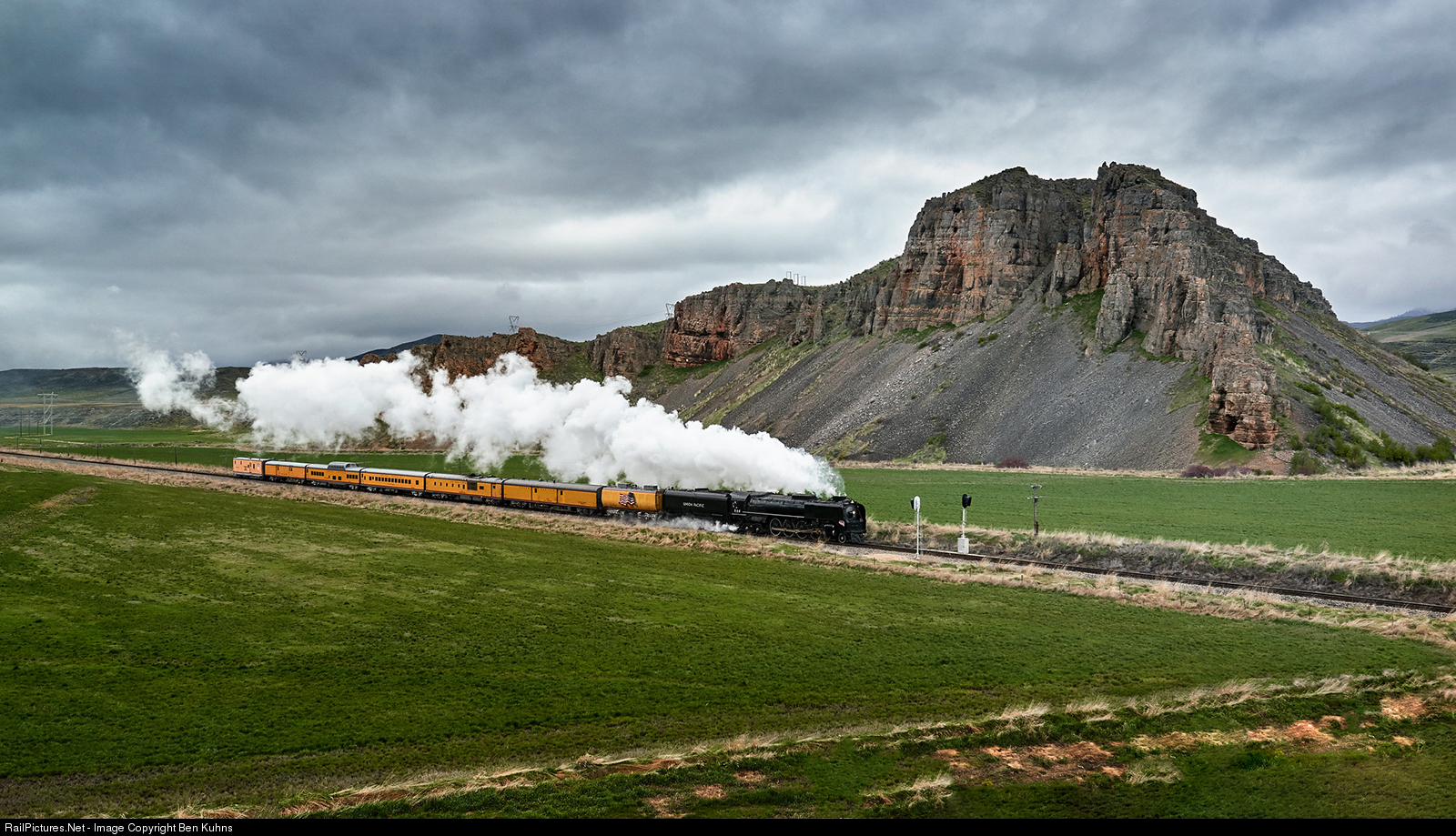 | UP 844 opens the taps with plenty of straight track to get into a groove. This "Northern" class locomotive was built in 1944 and has never been retired from active service. Her top speed is in excess of 100mph and despite her age she remains very capable.