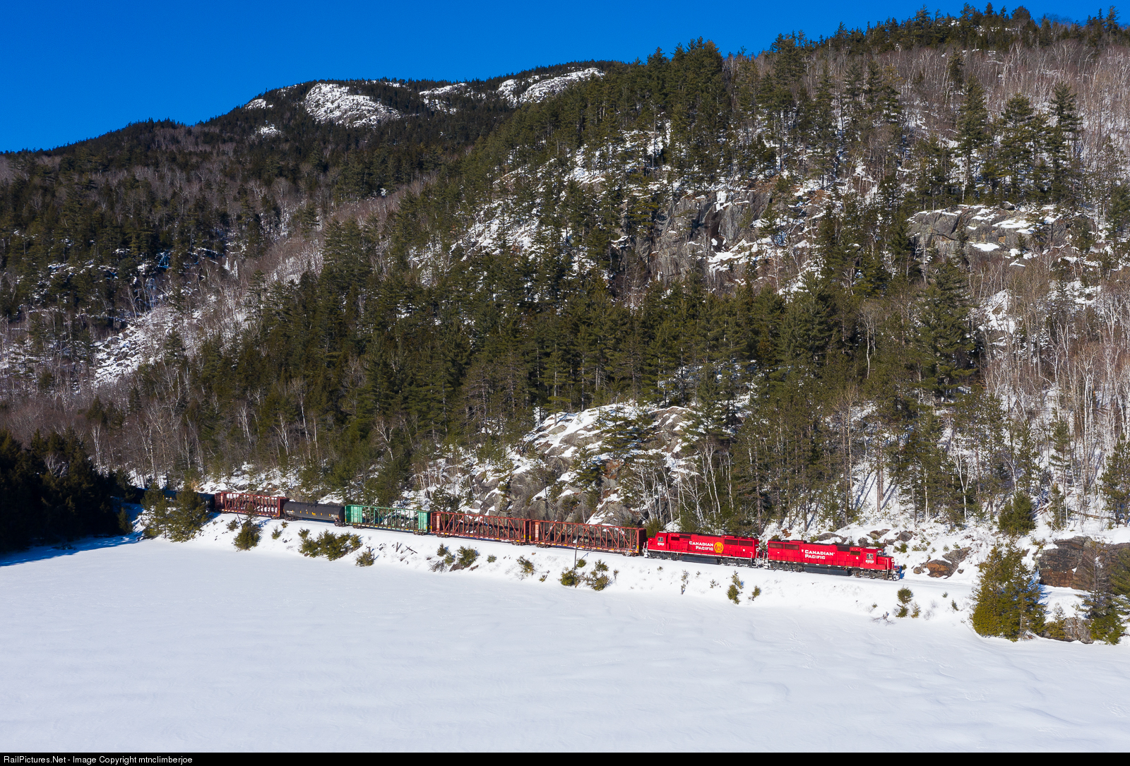 | A pair of SD60's cruise along the shore of Little Greenwood Pond as they lead CP 250 east through Bodfish, Maine on a sunny winter day. After passing through Greenville, the Moosehead Sub traverses through fairly remote wilderness until reaching Brownville Junction. |