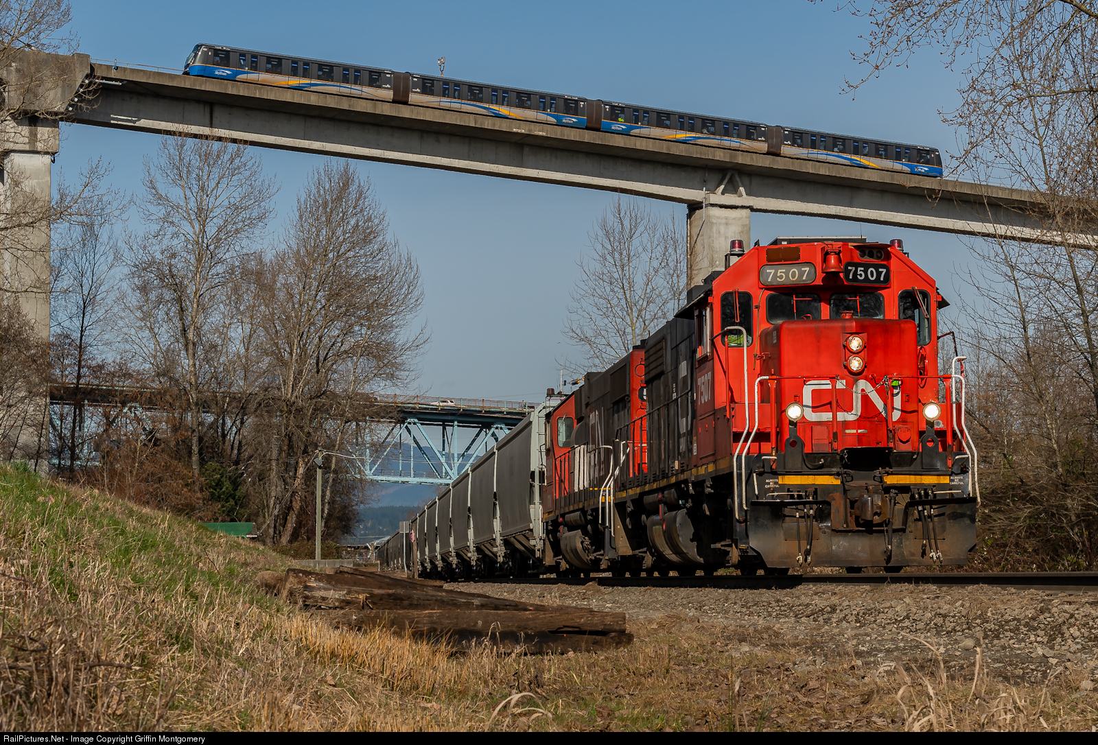 CN 7507 Leads The Brownsville Job As They Duck Under The Translink Skytrain Bridge.