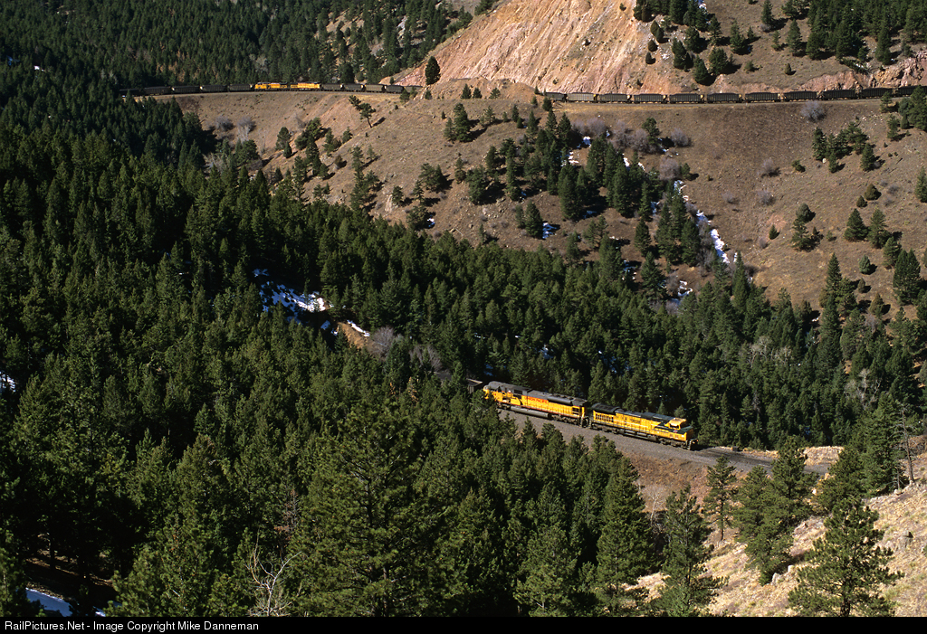 An eastbound Union Pacific coal train, led by Chicago & North Western AC4400CW No. 8818, drops down the two-percent grade out of Tunnel 15 and is about to enter Tunnel 14, near Crescent, Colorado, on March 30, 2002. The rear of the train is still in Tunnel 17, while the mid-train DPUs are on a fill approaching Tunnel 16 at the top of the photo. The large cut is the former Tunnel 17, now daylighted, and this horseshoe is in a location called South Draw on the former Rio Grande “Tunnel District.”