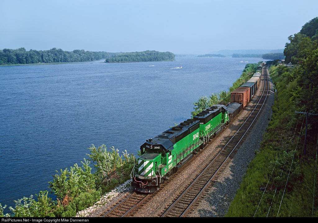 An eastbound Burlington Northern freight has followed the Mississippi River since departing the crew change point of La Crosse, Wisconsin, and is now approaching Savanna, Illinois on July 20, 1991. When the train gets to the junction at Plum River just south of Savanna, it will either head east to Chicago (likely), or south to Galesburg.