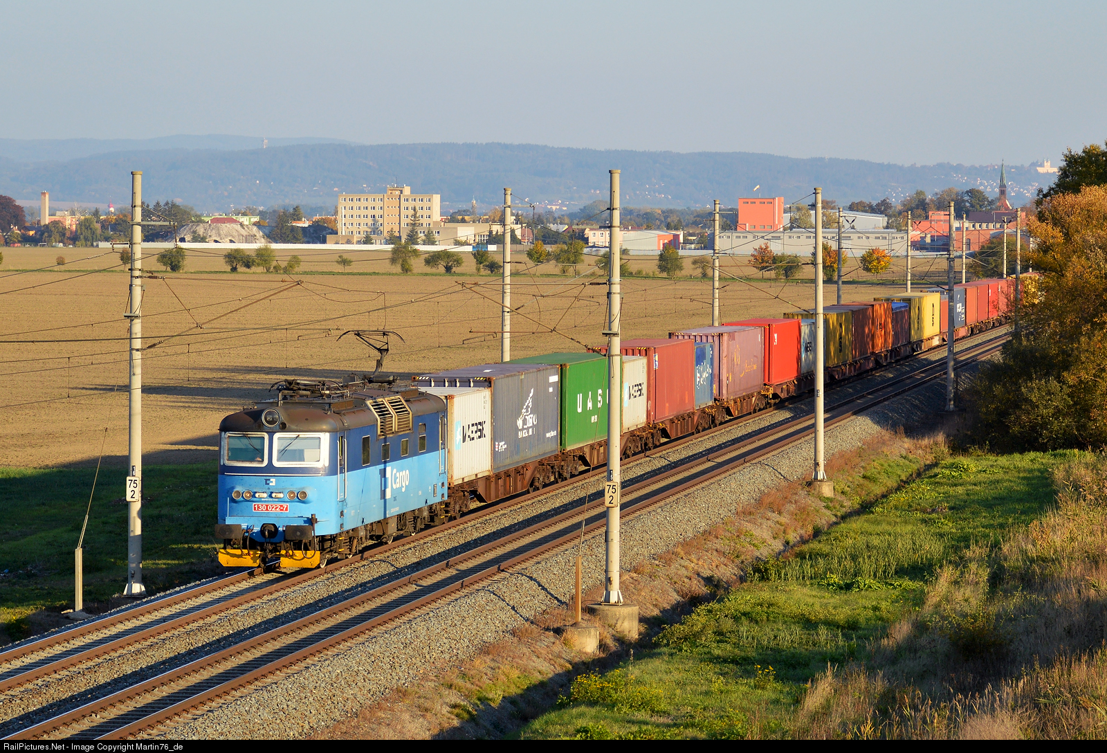 | In the glow of the last rays of the setting sun, the electric locomotive 130.022-7 hauling a container train, Passing the vicinity of the village Štěpánov visible in the background. |