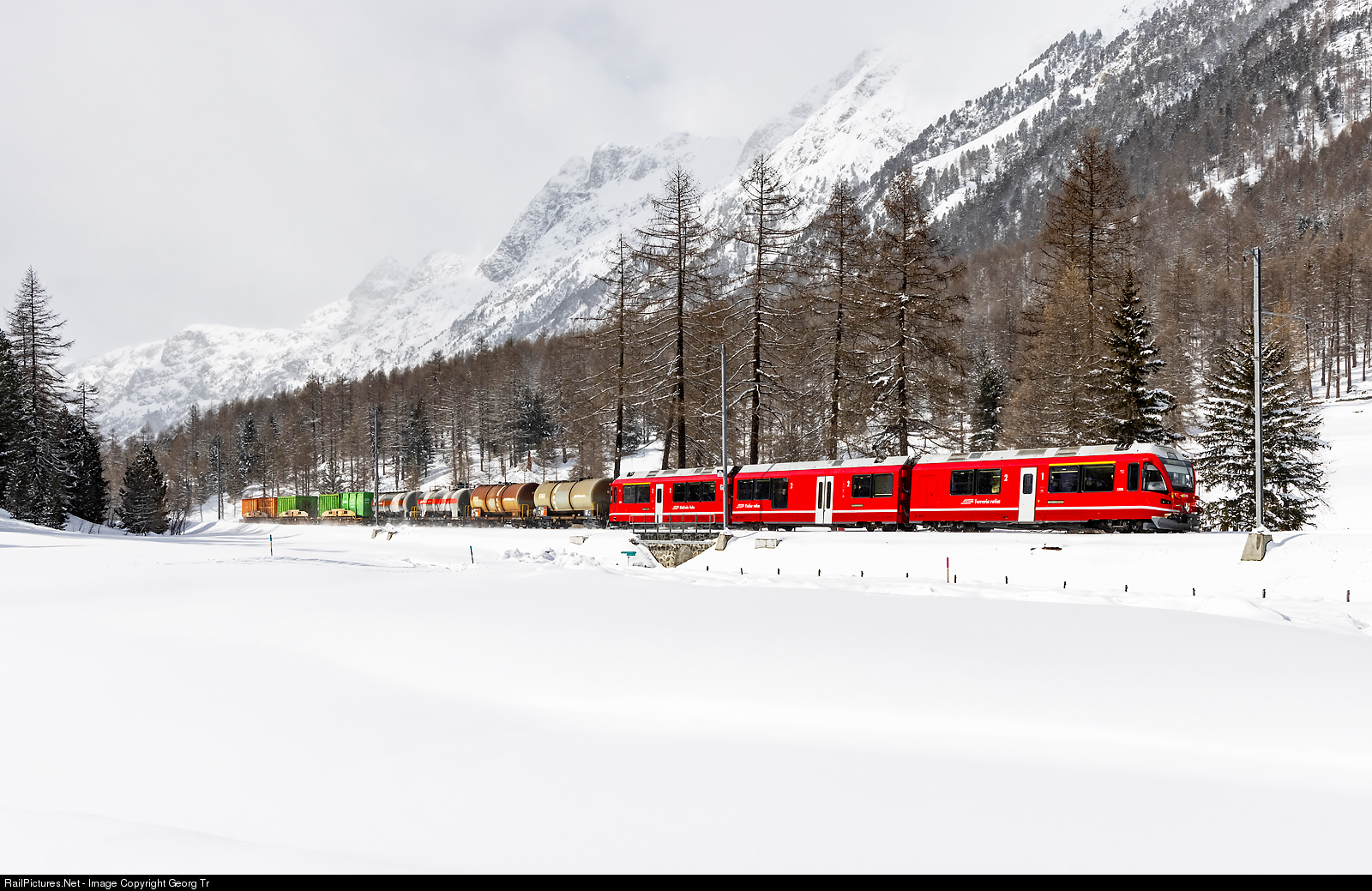 | Sometimes, you can see "Allegra" railcars pulling freight trains on the Rhaetian Railway, they are very powerful with 8 driven axles and 2800 kW. ABe 8/12 # 3508 is pulling freight 5135 from Landquart over the Albula line to Pontresina, through the Bever valley between Spinas and Bever. There are two loaded fuel oil tank cars and two loaded ciment tank cars in the train, and three flat cars with garbage or scrap iron containers. |