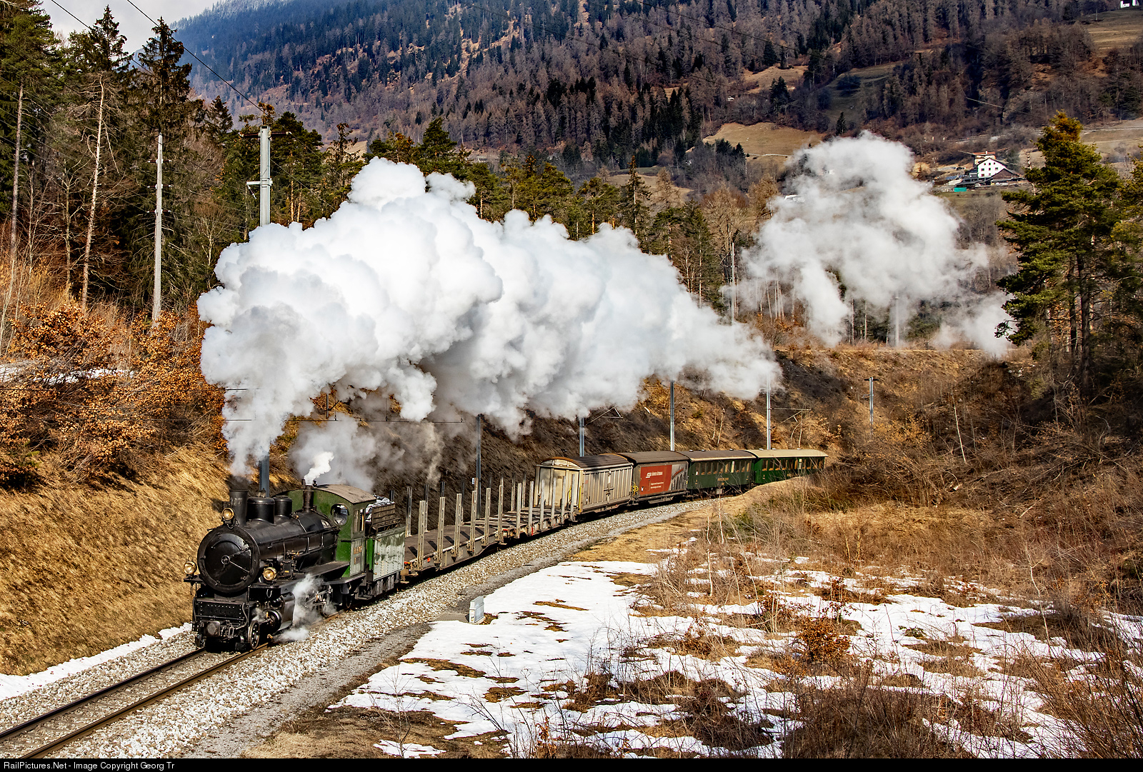 | 2-8-0 "Consolidation" steamlocomotive G 4/5 # 107 "ALBULA" of the Rhaetian Railway, built in 1906 by SLM Winterthur, is on a engineer training run "Davos round trip" from Landquart via Chur-Thusis-Filisur (Switchback, loc turned on the turntable)-Davos-Klosters back to Landquart. The mixed train with freight and passenger cars is on the heavy 2.5 % grade called "Bonaduzerstutz", gaining 54 meter height from Reichenau-Tamins up to Bonaduz. |