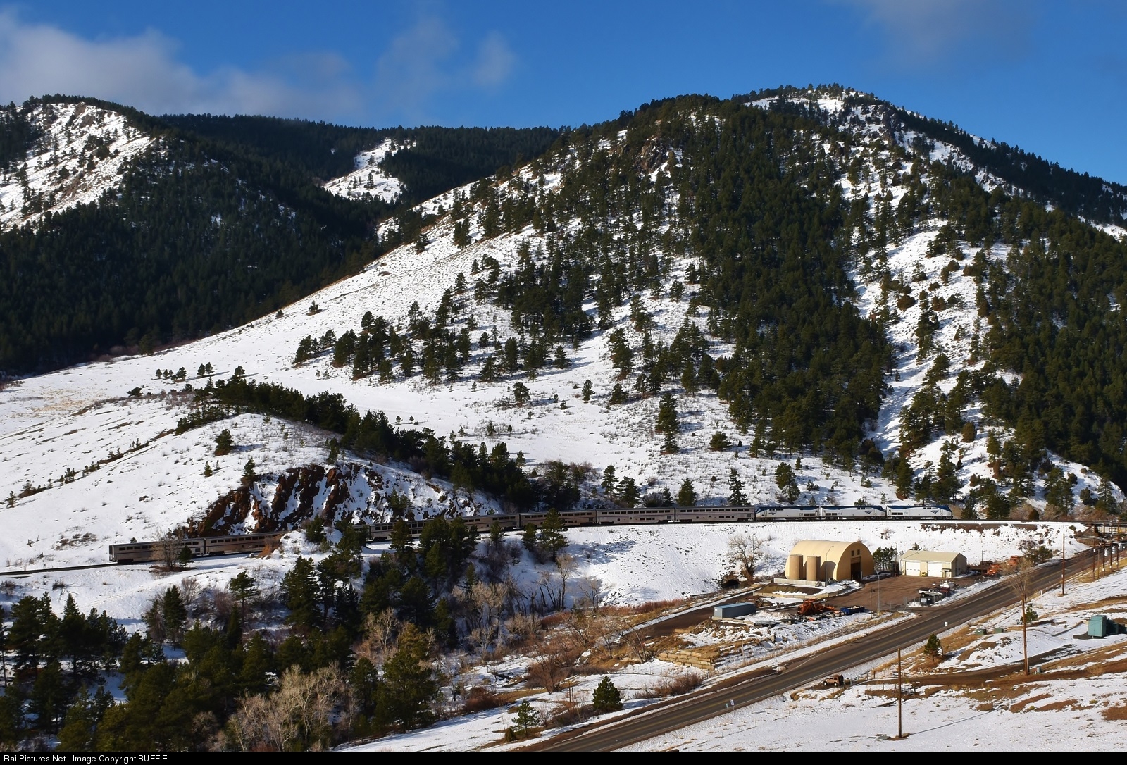 | The #5 California Zephyr has left Denver in the morning and runs through Coal Creek Canyon with three power units, perhaps in anticipation of the snowstorm that is suppose to hit later in the day. |